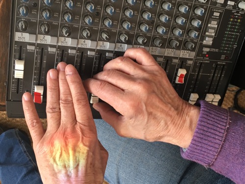 Aura Satz, 'Making a Diagonal with Music / Hacer Una Diagonal con la Musica', film still, 2019 A short film about the Argentine electroacoustic composer Beatriz Ferreyra, an original pioneer of early musique concrete alongside Pierre Schaeffer during the '50s and '60s. Here she discusses her 'sound hunting' recording techniques, and other thoughts on sound montage and spatialization. Featuring creaking doors, barking dogs and rainbow hands.