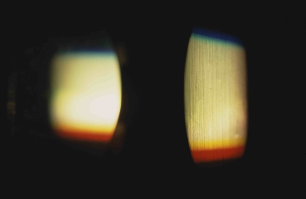 Aura Satz, Doorway for Natalie Kalmus, production still, 2013 Doorway for Natalie Kalmus is a film centred around the use of colour in moving image technology, exploring the disorienting technicolour prismatic effects of the lamp house of a 35mm colour film printer. Through minute shifts across an abstract colour spectrum, punctuated by a mechanical soundtrack, the film evokes kaleidoscopic perceptual after-images (bringing to mind Paul Sharits, Dario Argento and the Wizard of Oz). Natalie Kalmus was the ex-wife of technicolour inventor Herbert Kalmus, and was the colour consultant for hundreds of colour films, including The Wizard of Oz, Gone with the Wind, the Red Shoes, Black Narcissus and many more. She would draw up colour scores for each film, like music scores, according to her theories of "Colour Consciousness". She also authored a short article entitled "Doorway onto another world", in which she described her sister’s deathbed experience of seeing deceased family members.
