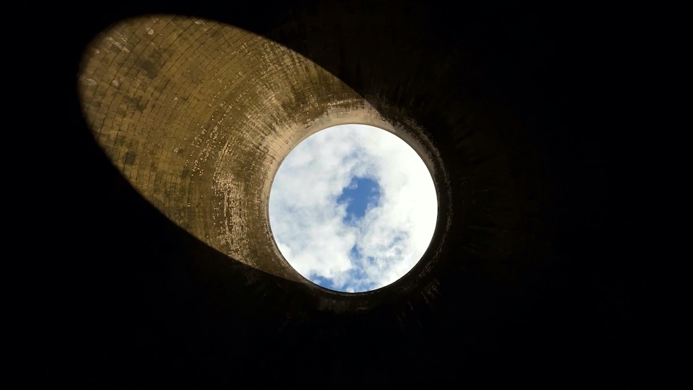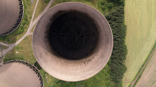 'The Grief Interval' film still, (Fiddler's Ferry in Warrington, currently decommissioned) 2021 Aura Satz collaborates with electroacoustic composer Sarah Davachi to sonically haunt a decommissioned coal fired power station. Weaving eerie aural warning and mourning, the project summons the possibility of the pause in a landscape of looming ecological emergency.