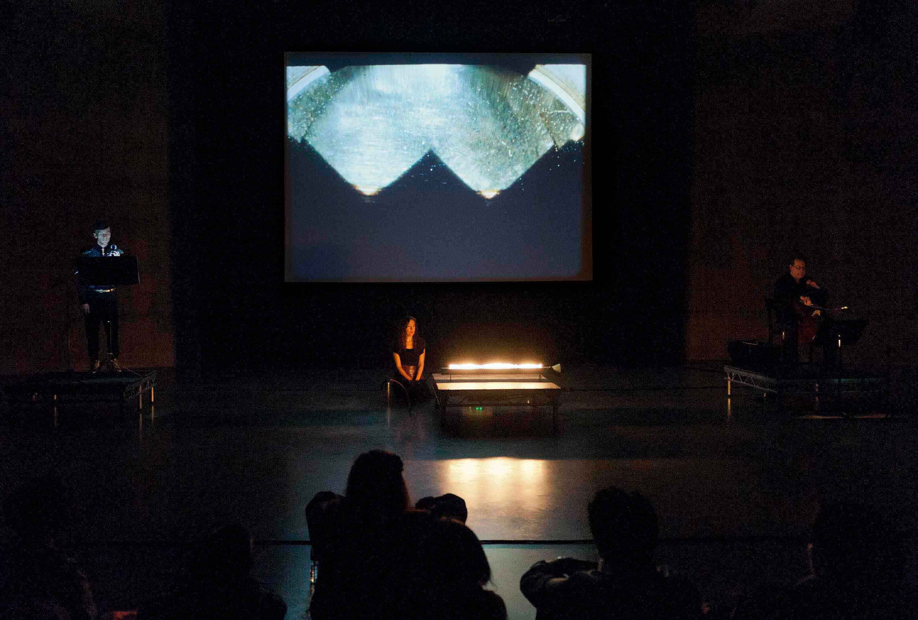 For the inaugural version at the Tanks, the live performance features the vocals of interdisciplinary artist Mikhail Karikis and Anton Lukoszevieze on cello. This performance is linked to the symposium Playing in the Shadows, exploring the subterranean darkness of The Tanks and radical experiments in projection and performance.