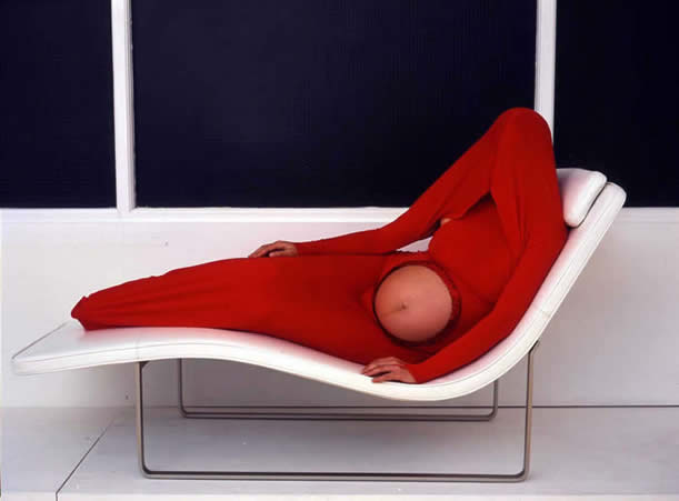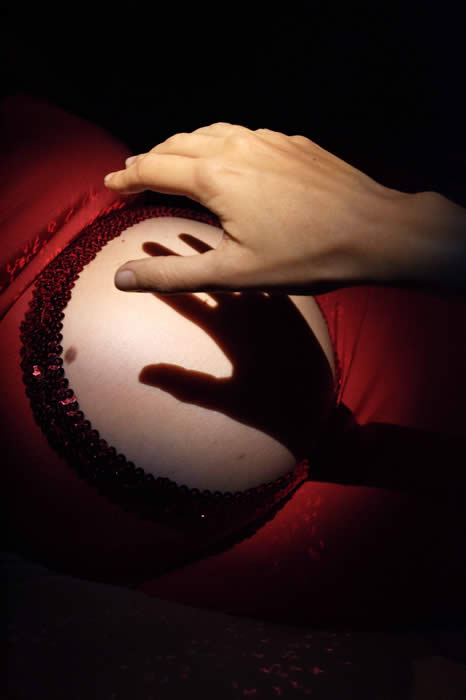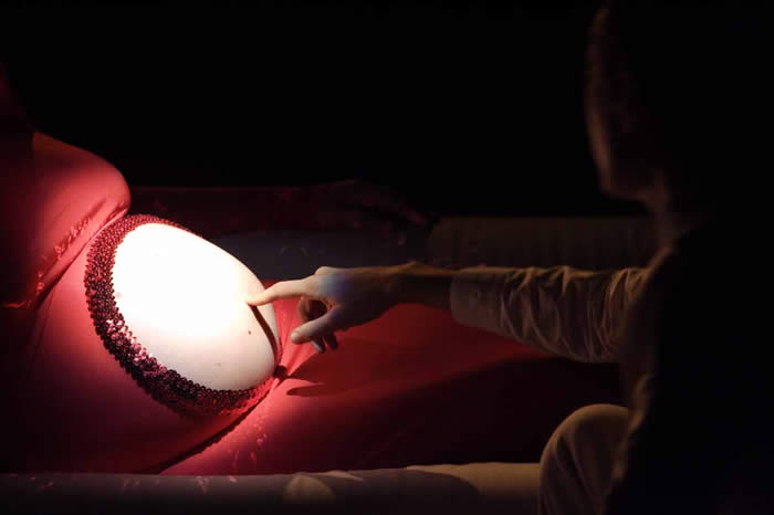 Aura Satz, Ventriloqua, 2003-4, photo Karni Arieli Originally performed at the final stages of Aura Satz's pregnancy in 2003, 'Ventriloqua' is a video-performance of a one-off event in which the musician Anna Piva played the electromagnetic waves of her belly using a theremin. A truly literal ventriloquist act of 'belly-speaking', the artist was transformed into a musical instrument, an antenna, a medium, through which an otherworldly voice was transmitted. Like an immobile tableaux vivant or an anatomical wax model, the body became a vessel, a mouthpiece through which the disembodied voice appeared re-embodied. One body placed within another body, speaking and spoken through, producing abstract musical utterances which might predict the future, although destined to remain in an amniotic amnesia.
